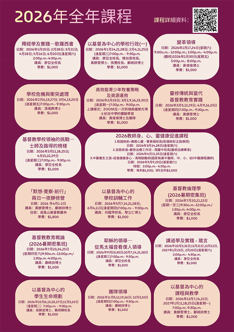 研究院課程專為培訓中、小學、幼稚園基督徒教師、行政人員及對教育有負擔之基督徒而設。歡迎在職教師、現正於教育學院進修之主內人士、教會傳道及肩負教導工作之教會同工修讀。
